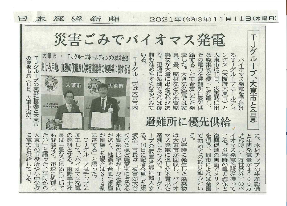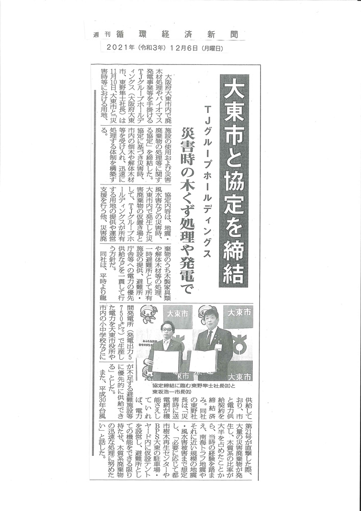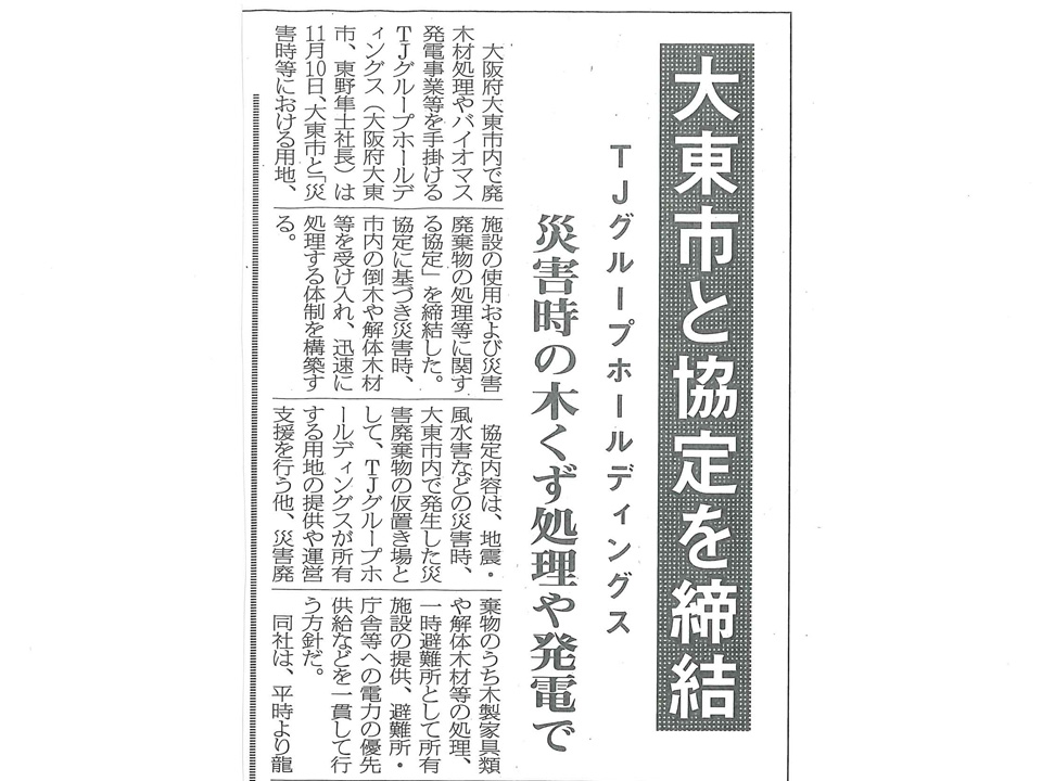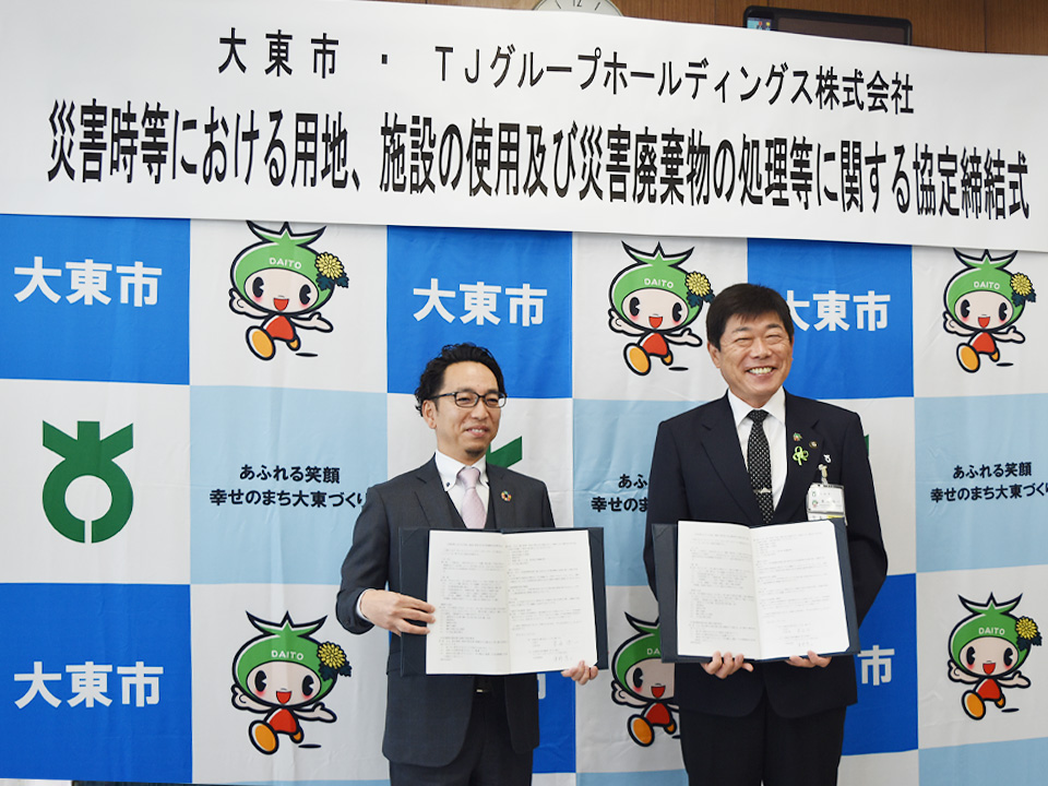 TJグループホールディングス株式会社は、大東市と「災害時等における用地、施設の使用及び災害廃棄物の処理等に関する協定」を締結し、11月10日(水)に調印式を行いました。